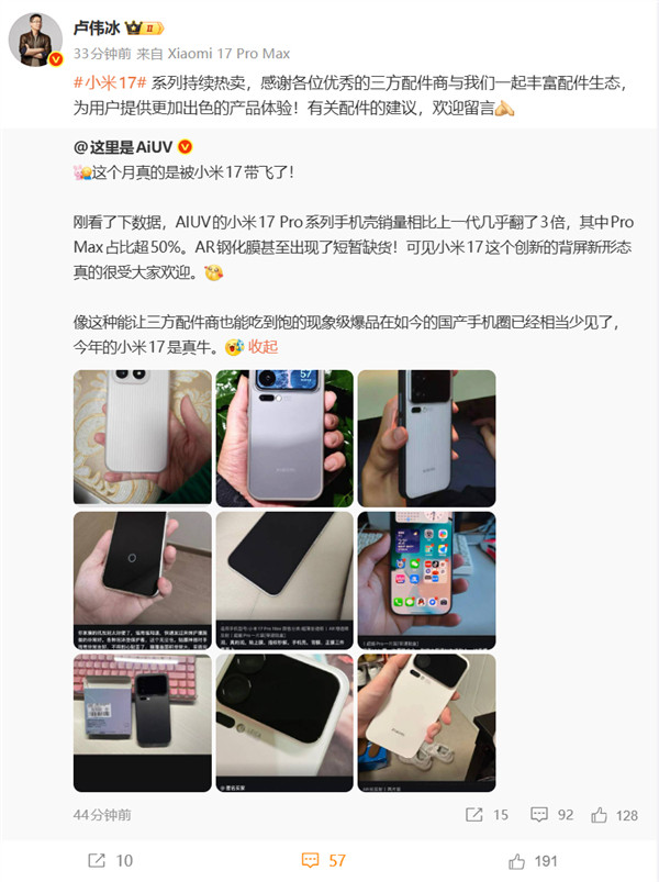 随后,小米集团合伙人、总裁,手机部总裁卢伟冰转发上述微博回应道:“小米17系列持续热卖,感谢各位优秀的三方配件商与我们一起丰富配件生态,为用户提供更加出色的产品体验!有关配件的建议,欢迎留言。”