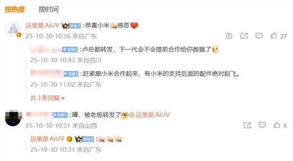 “恭喜小米,感恩”,@这里是AiUV在评论区回复称。